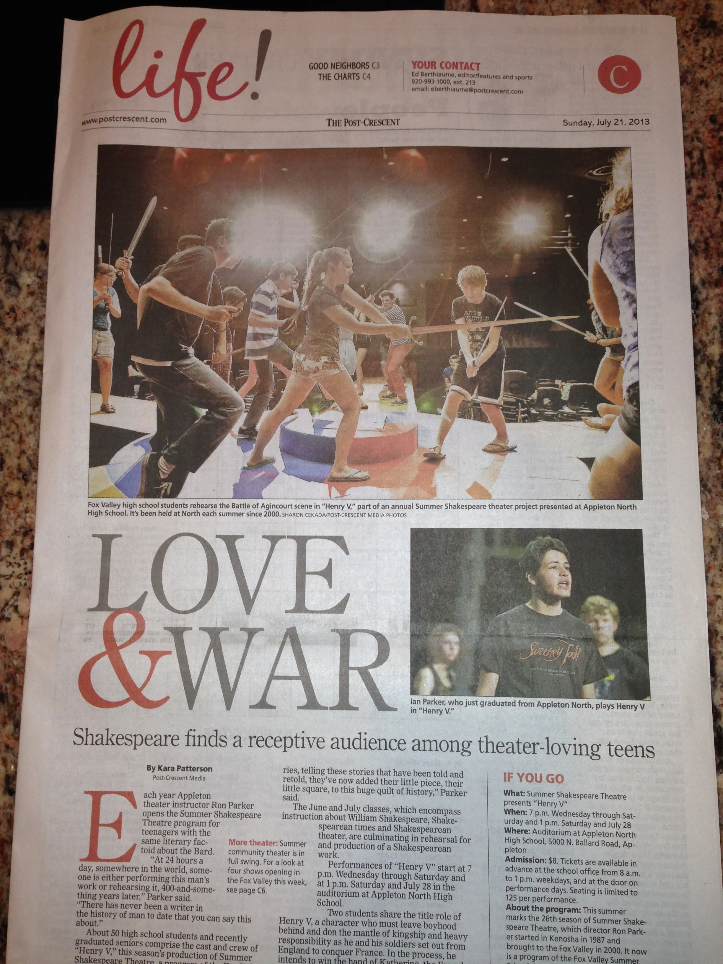 Summer Shakespeare Theatre is a six-week course which runs from mid June through late July, in which participants learn about Shakespeare, his times, and theatre by preparing and presenting one of his plays for public performance. The program had its beginning in Kenosha before being transplanted to Appleton North in 2000.